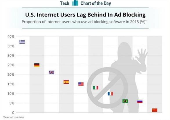 比如下图是其统计出的一些数据,根据下图显示,希腊网民使用广告拦截软件的人数比例最高,美国排在中游位置,而中国网民对广告的耐受性最高。所以,我觉得完全有有理由怀疑其可信度。