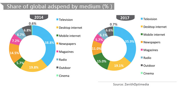 桌面互联网广告将继续增长,但今年会第一次减少市场份额,桌面互联网全球广告支出占比从2014年的19.8%下降到2015年的19.4%。根据实力传播的预测,到2017年桌面互联网将会占到全球广告支出的19.1%。与此同时移动互联网广告所占的比重将会从2014年的5.7%,增长到2017年的15.0%,总体而言,到2017年,互联网广告将占全球广告支出的34.0%,稍微落后于电视的35.9%。两个媒体之间的市场份额差距将从2014年的13.3%缩小到2017年的1.9%。按照这样的增长速度,互联网广告将在2018年超过电视广告。