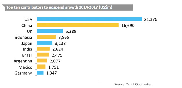 实力传播预计2015年全球广告支出将增长4.0%,达5540亿美元,2016年受里约夏季奥运会和美国总统选举的推动,将增长5%。而没有这些大事件的2017年,增长率将略微下降至4.4%。