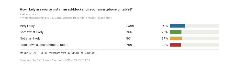 有54%的智能手机用户表示很有可能会下载一个屏蔽广告的插件